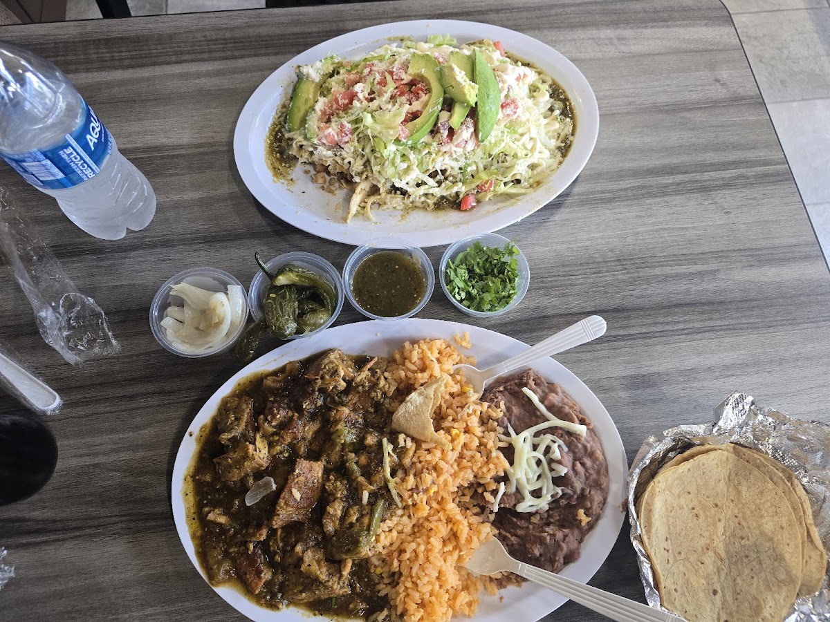 Steak and chicken fajitas with rice, beans, cheese, bell peppers, onions, lettuce, tomato and avocado.